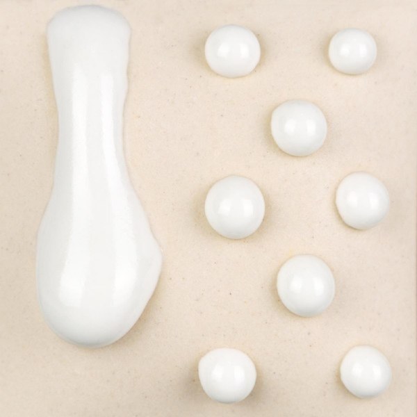 Effects are achieved by applying glaze with a syringe or squeeze bottle on greenware or soft fired, cone 04 stoneware bisque (1940°F/1060°C). Apply dots in varying thickness and patterns. For more movement and a dripping effect, apply larger dots on a vertical surface. Fire to preferred temperature; cone 5-10 (2167°F-2345°F/ 1186°C-1285°C). Sample tile was fired to cone 6 oxidation (1222°C/2232°F).