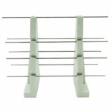 This rack measures 8" tall and is made from two durable stoneware supports. It includes seven pieces of 10" long nichrome wires. The wires rest on grooves in the rack, so they can be easily rearranged to accommodate different size pieces.